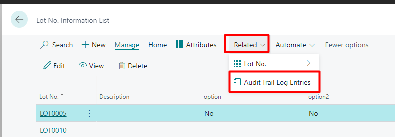 On Advance Lot No. Information List, as well as on Lot Information Card and Lot No. Information List, there’s an action called “Audit Trail Log Entries”: