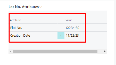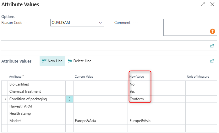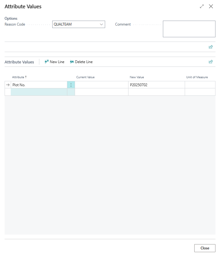 If the Lot already has attributes, it’s possible to define the new attribute value in “New Value”. When you “Close” the page, the value is updated.