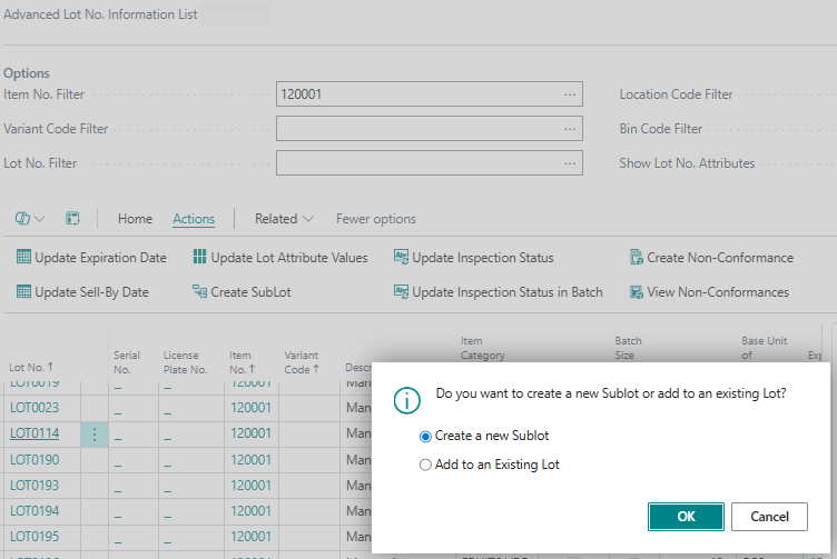 On Lots, when creating Sublot or merge Lot, it’s possible to choose if attributes are inherited from the original lot or change values.