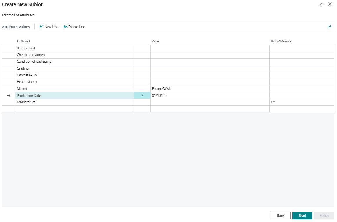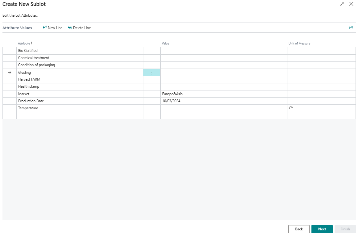 When clicking “Finish”, the Sublot has the attributes previously chosen: