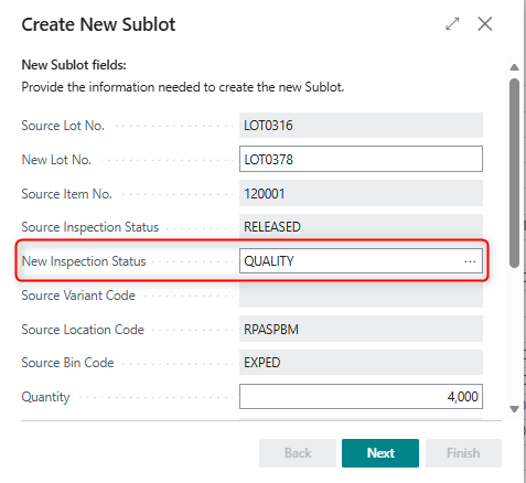 During Sublot creation is possible to define the Inspection Status for the New Sublot: