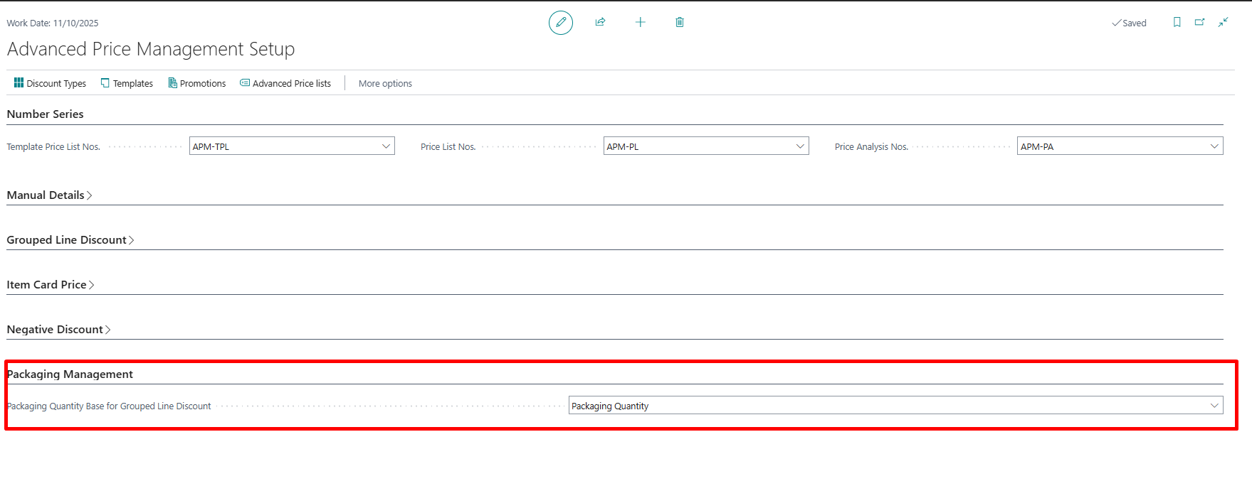 | Packaging Quantity Base for Grouped Line Discount | Field only shown if Packaging app is installed. Specifies the Packaging Quantity Base to calculate the Grouped Line Discount %. |