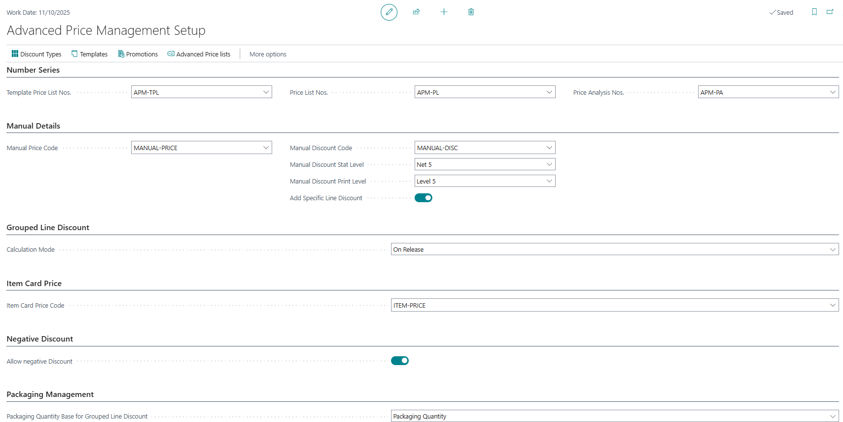 | Packaging Quantity Base for Grouped Line Discount | Field only shown if Packaging app is installed. Specifies the Packaging Quantity Base to calculate the Grouped Line Discount %. |