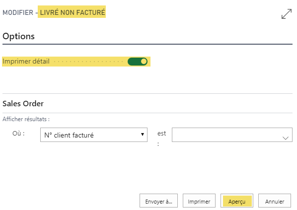 La case à cocher « Imprimer détail » permet d’avoir le détail des articles non facturés.
