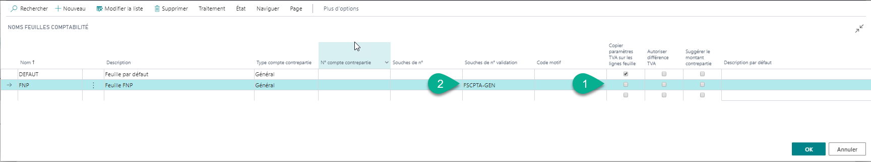 Il est recommandé (mais pas impératif) de créer une feuille comptable de type « Abonnement » distincte pour la saisie comptable pour les OD de FNP/ANP. Dans la feuille de comptabilité créée, ne pas cocher «Copier paramètres TVA sur les lignes feuille». Ne pas oublier de compléter la souche de N° de validation.