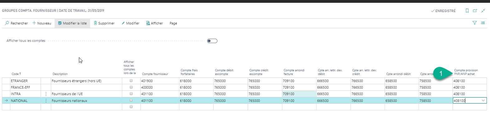 Pour chaque groupe comptable fournisseur, vous pouvez des comptes définir les comptes fournisseurs – factures non parvenues et fournisseurs – avoirs non parvenus spécifiques sur lesquels les montants TTC des FNP/ANP seront provisionnés.