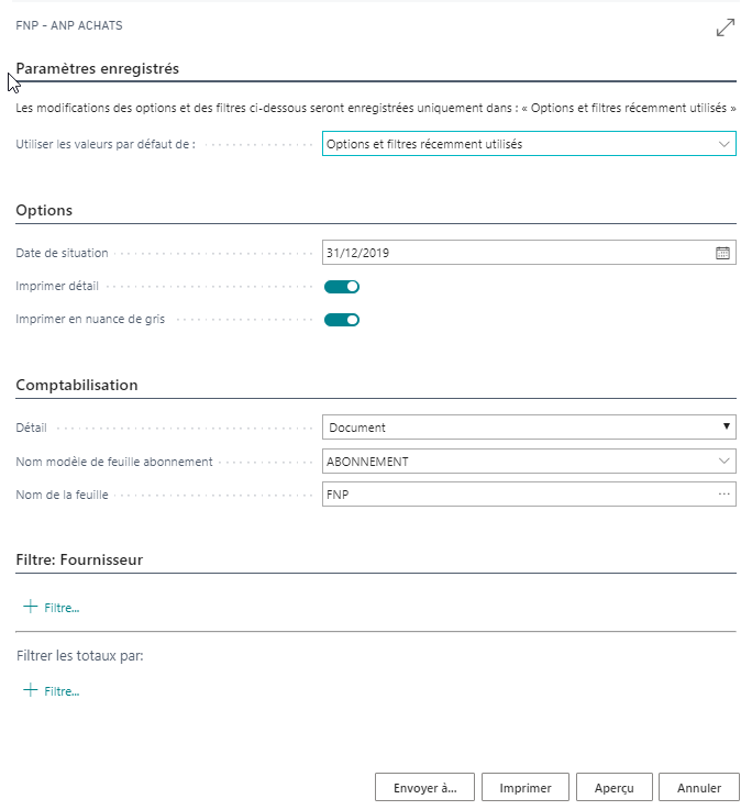 Depuis la barre de recherche, rechercher le rapport « FNP – ANP achats ». Dans la mesure ou vous ne souhaitez pas créer d’OD de comptabilisation, sélectionner l’option « Pas de comptabilisation ». La date de situation vous permet de définir à quelle date le calcul des FNP/ANP doit être effectué.