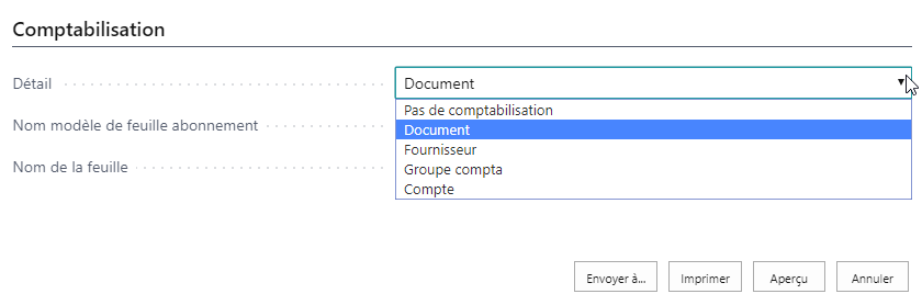 Détail: Les options disponibles sont par document, fournisseur, groupe compta., compte Les écritures de provision seront créées suivant le niveau de regroupement souhaité.