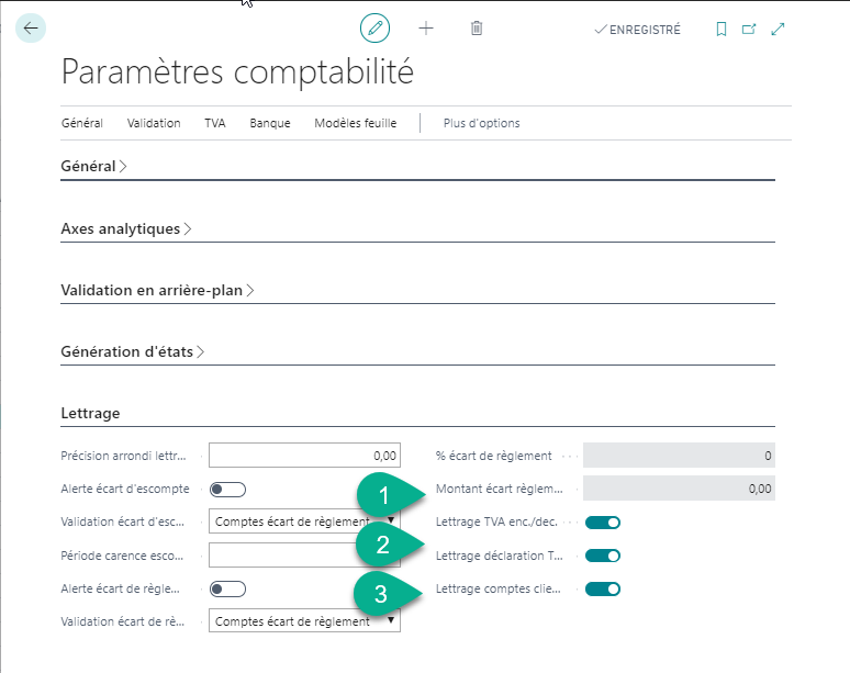 | 2. Lettrage automatique déclaration TVA | Si activé,Lettre automatiquement Lorsque la déclaration de TVA est validée ET que les comptes sont soldés les écritures sont lettrées. Si désactivé,Lettrage manuel. |