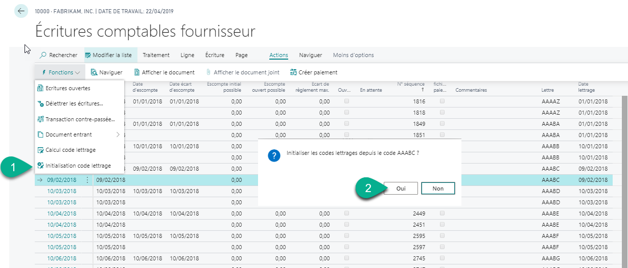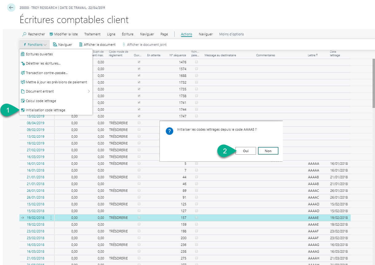 - Action > Fonctions > Initialisation code lettrage