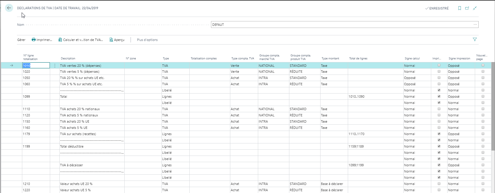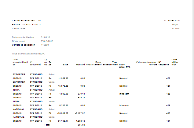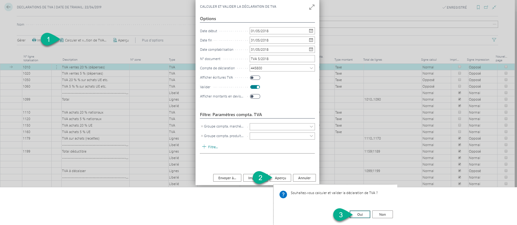 Le calcul du résultat de la déclaration de TVA est affiché.