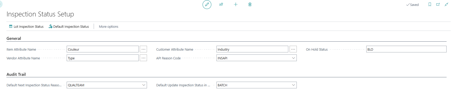 If Audit Trail is installed, Inspection Status Setup has 2 new fields: