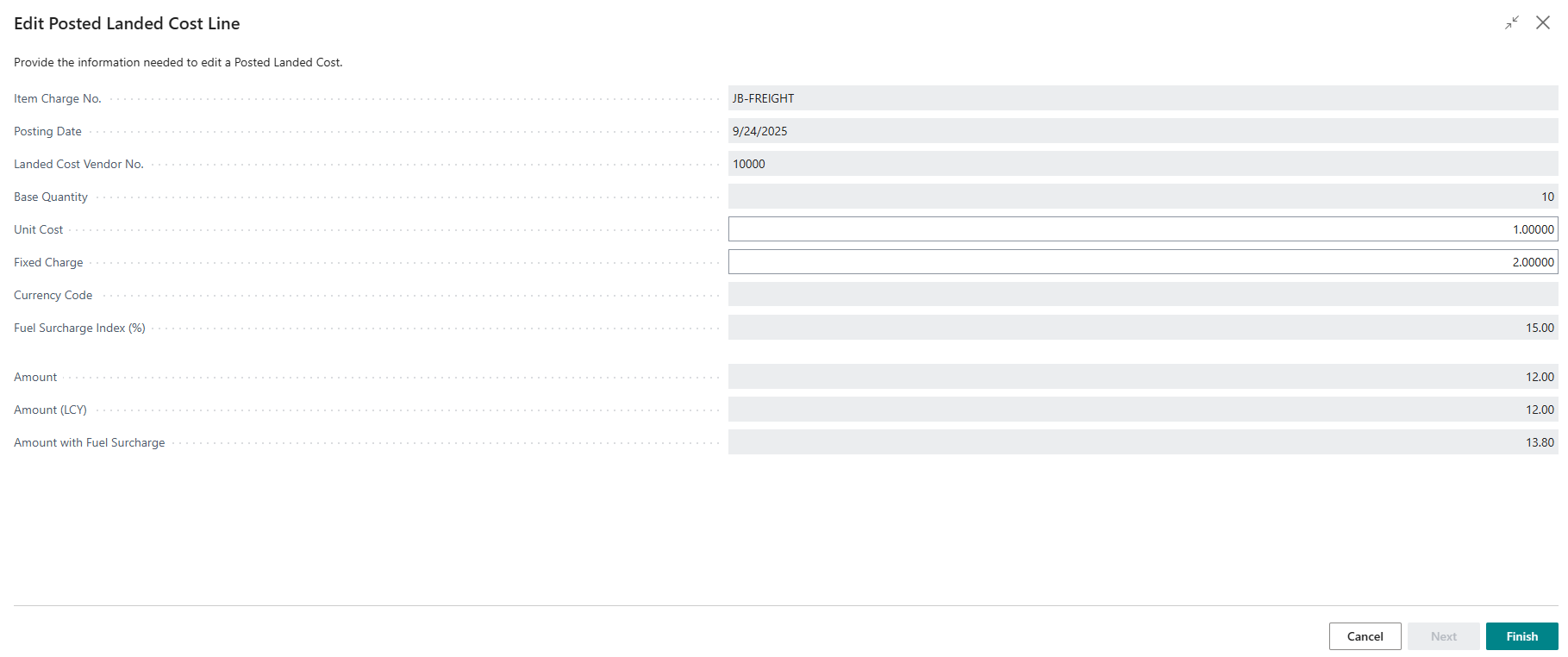 The fields ‘Amount’, ‘Amount (LCY)’, ‘Amount with Fuel Surcharge’ are automatically re-calculated.