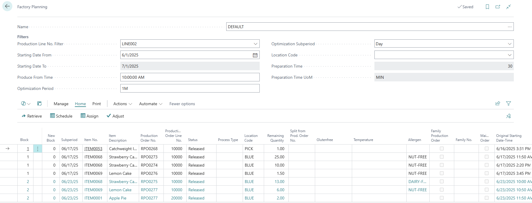 - Mandatory Filters: Users must define values for Production Line, Starting Date From, and Optimization Period before using the Retrieve action.