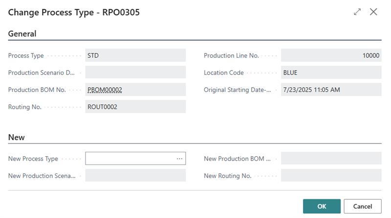 Change Process Type | Change the Process Type that is the basis for creating the Production Order Component List and Routing. |