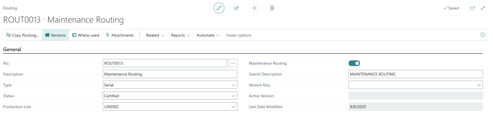Single-Line Enforcement: When Maintenance Routing is enabled, the Routing must contain exactly one line, with Type set to Work Center and No. set to the Maintenance Work Center defined in Factory Planning Setup. If these conditions are not met, the system will display an error and prevent changes.