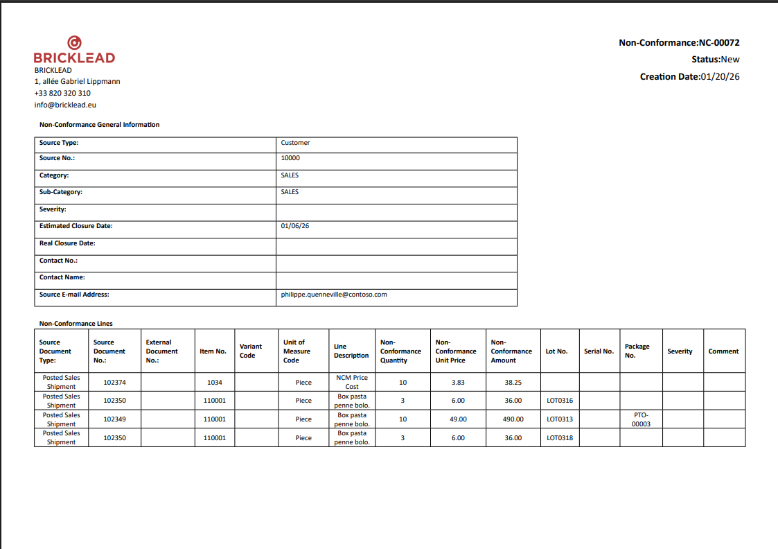 Result: When printing or emailing, the system automatically uses the appropriate layout based on the non-conformance type.