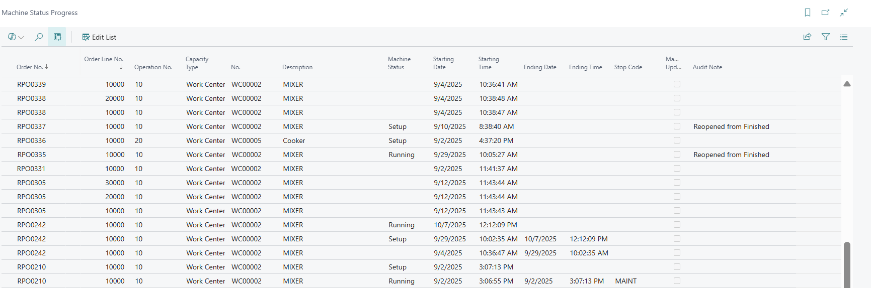 Machine Status Progress is available for released production orders when “Allow Machine Status” is enabled in Production Follow-Up Setup.