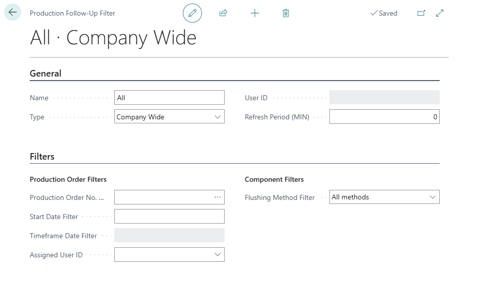Production Order No Filter | Specifies the number of the production order to be filtered. |