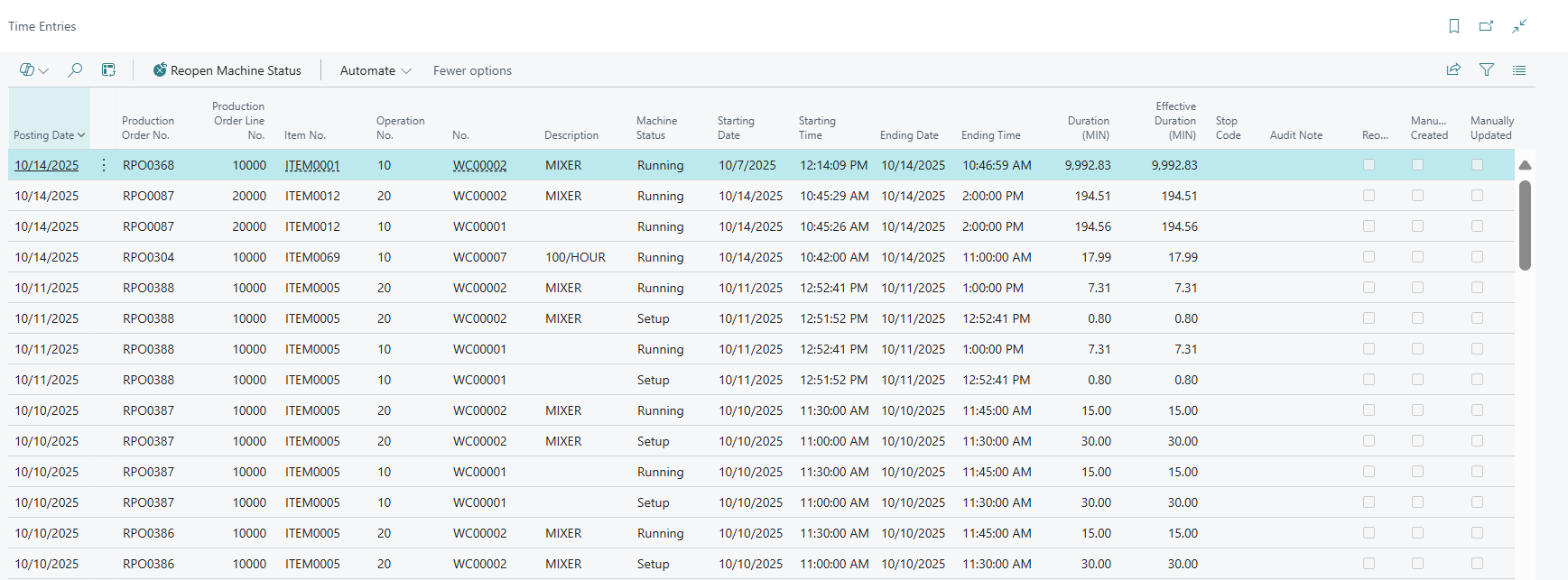 - The Time Entries page displays all lines related to changes in Machine Status for each production order and operation.