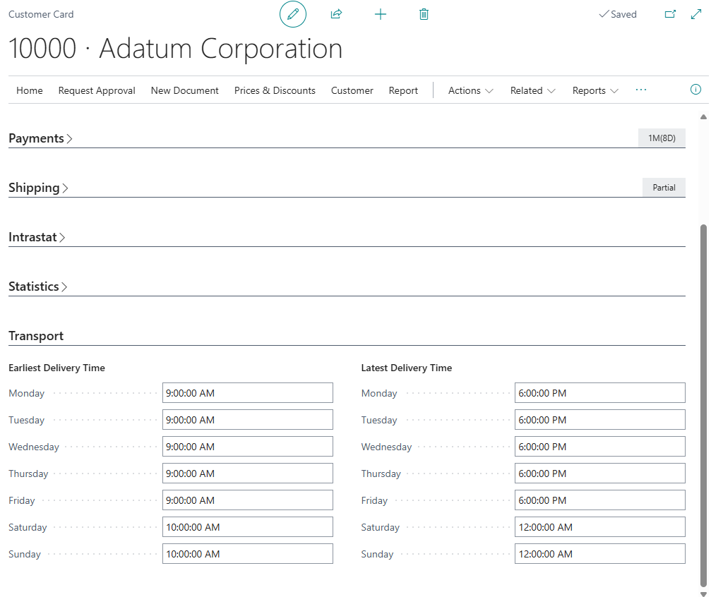 On the Sales Order Header, the fields Latest Delivery Time and Earliest Delivery Time will inherit the value from the Customer or Ship-to Adress, depending on the Ship-to field, based on Promised Delivery Date. The Sales Order Lines fields will inherit the value from the header. Delivery times are not inherited when a Custom Address is used.