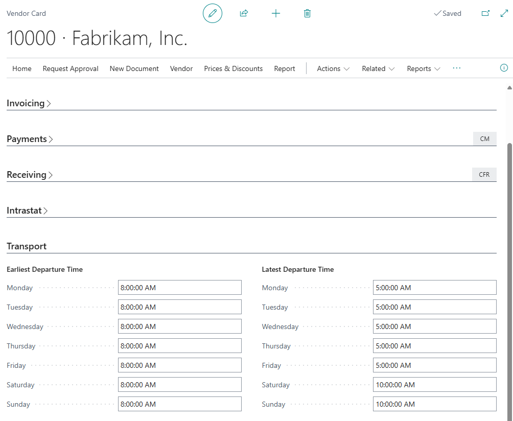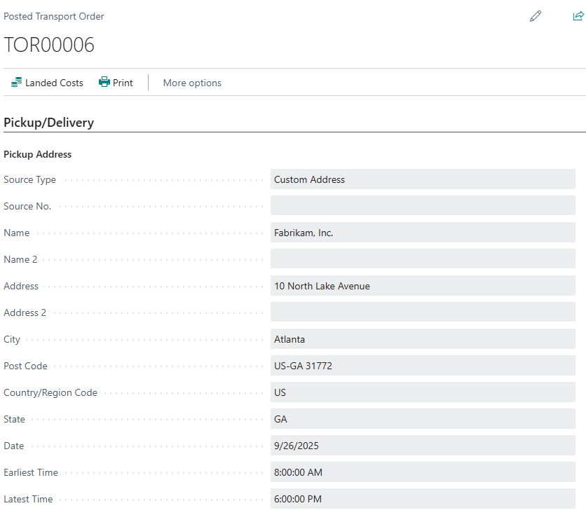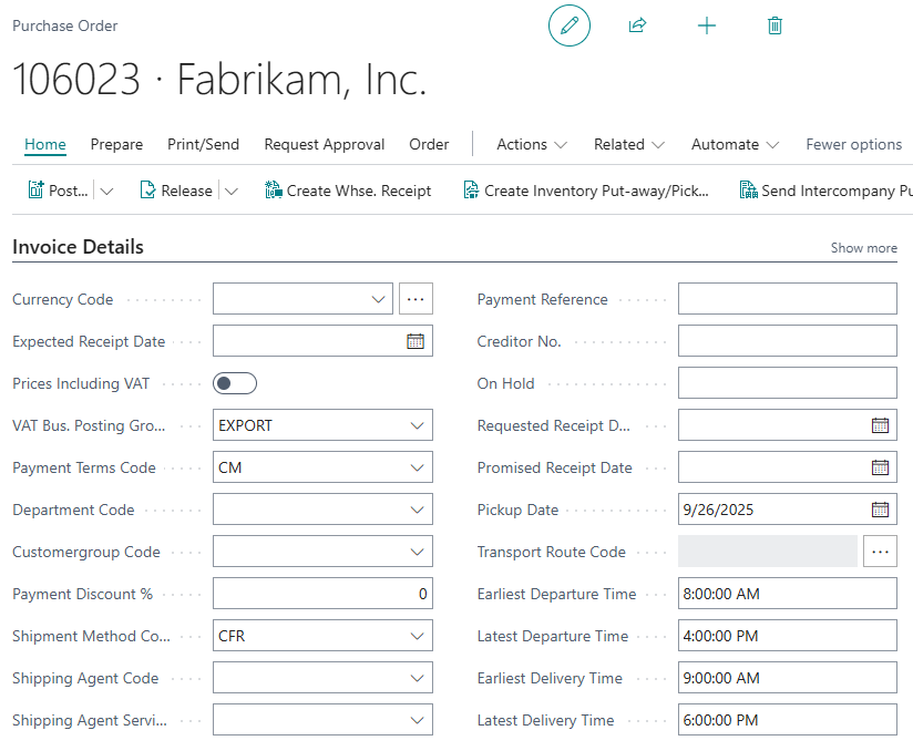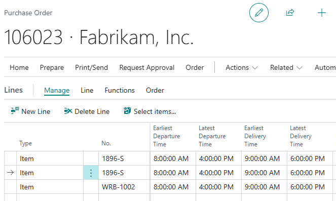 On the Purchase Order Header, the fields Latest Departure Time and Earliest Departure Time will inherit the value from the Vendor or Order Address card, depending on the Alternate Vendor Address Code field, based on Pickup Date. The Purchase Order Lines fields will inherit the value from the header.