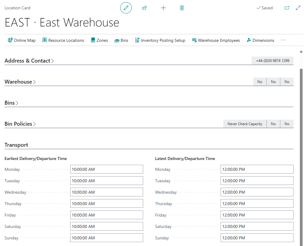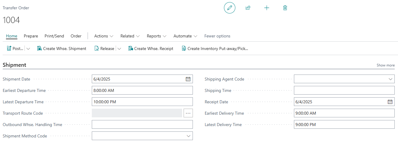 On the Transfer Order Header, the Latest Departure Time and Earliest Departure Time will inherit the value from the Transfer-From Location Card, based on Receipt Date.
