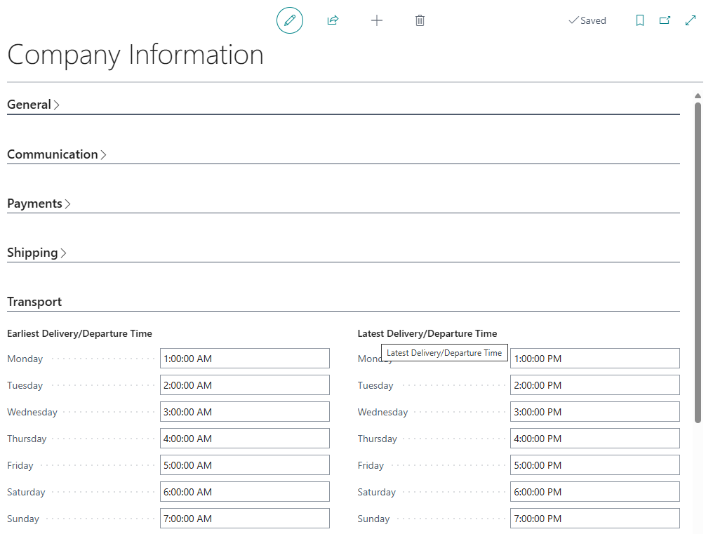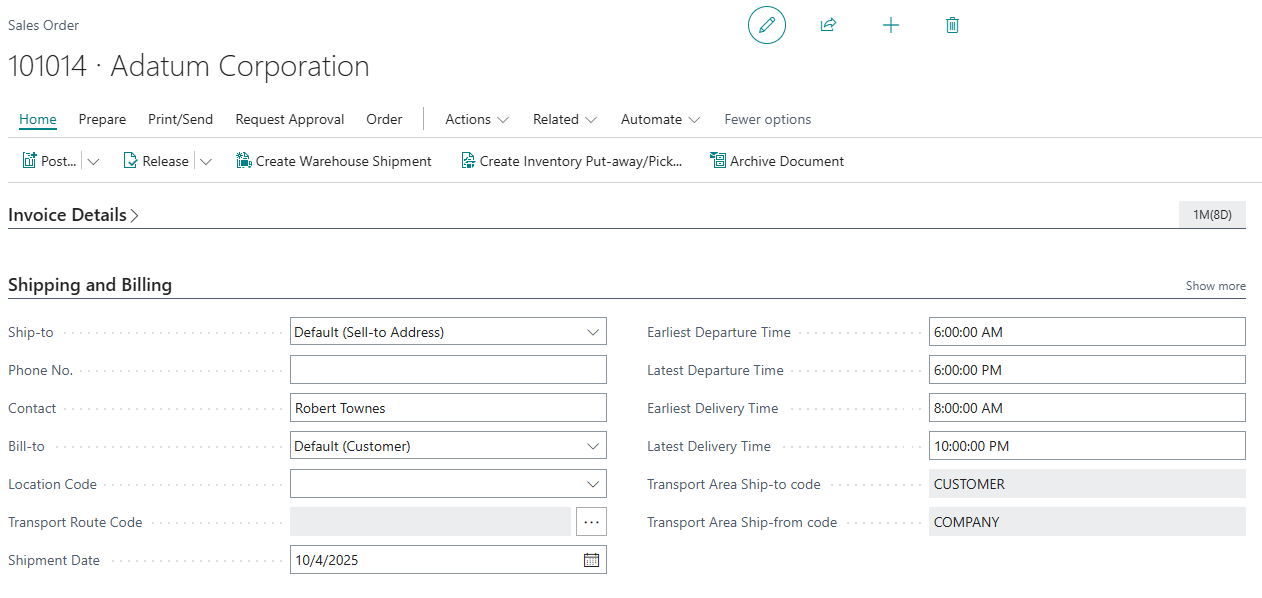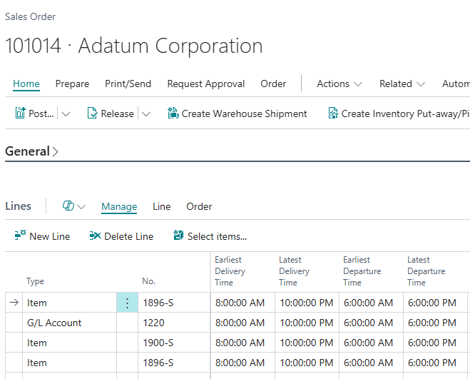 On the Sales Order Header, the fields Latest Departure Time and Earliest Departure Time will inherit the value from the Location or Company Information card, depending on the Location Code field, based on Shipment Date. The Sales Order Lines fields will inherit the value from the header, expect if the user manually changes the Line’s location code.