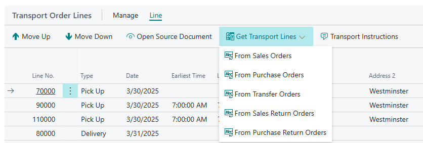 If a Transport Order Type requires multiple addresses, then it is not possible to create through a Sales/Purchase/Transfer Order, but only from a “Transport Planning Worksheet”.