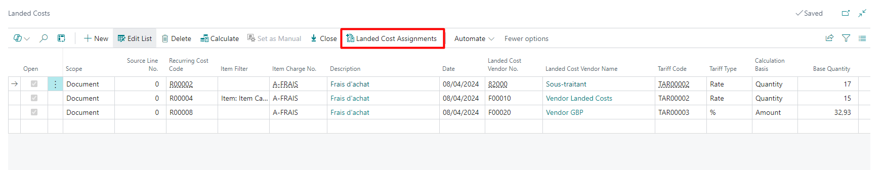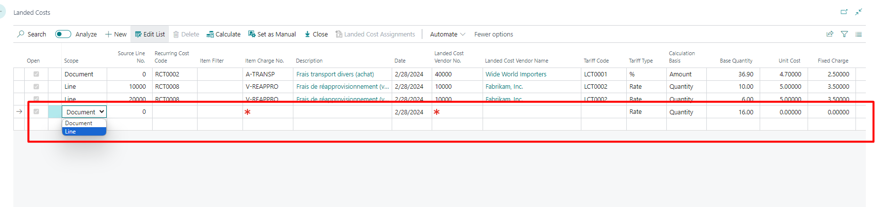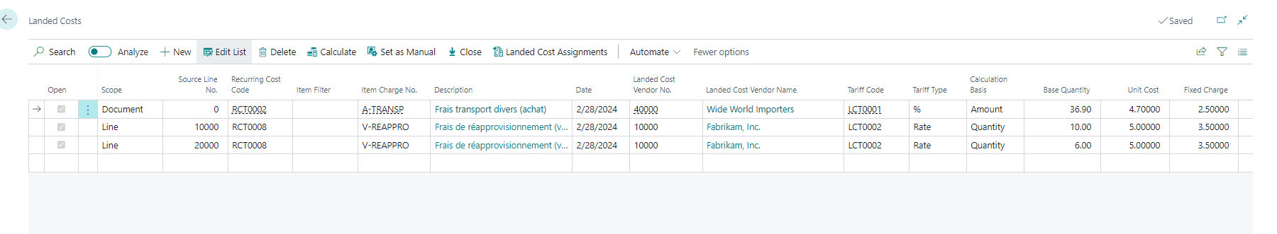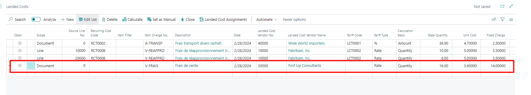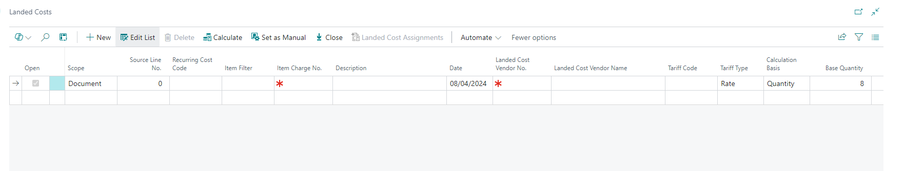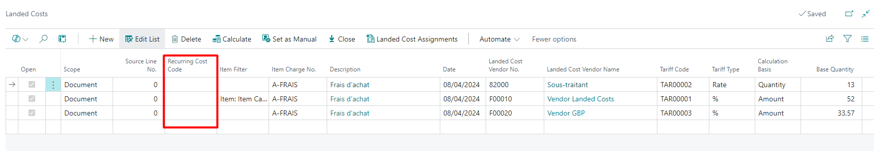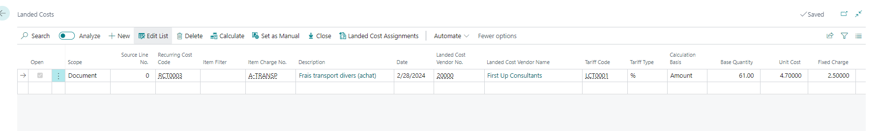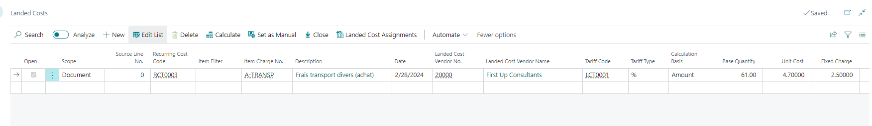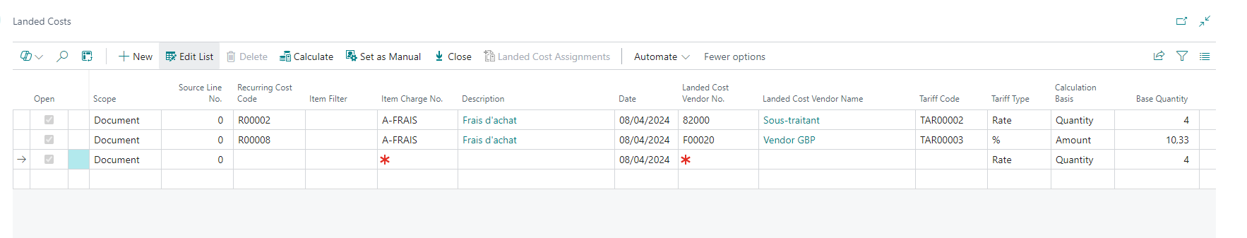 When opening Landed Costs, it is possible to see all the lines automatically calculated (if Item and/or Vendor are set on Recurring Costs):
