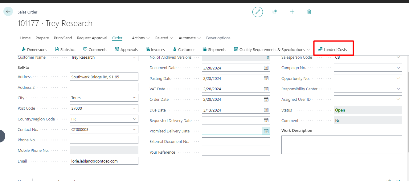 Sales orders created from Blanket orders will inherit the Landed Costs “Unit Cost” from the Blanket Order, even if the quantity is less than originally calculated and even if the tariff used has a different “Unit Cost” applicable to the “Base Quantity” of the Landed Cost.