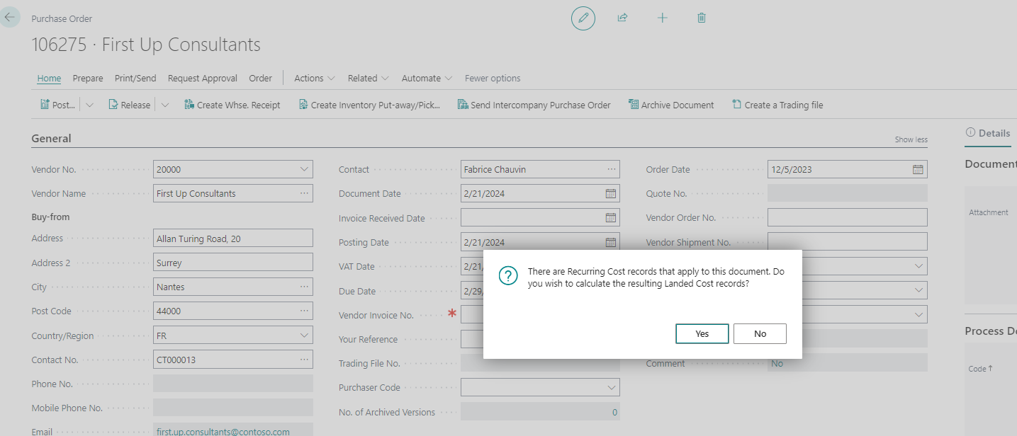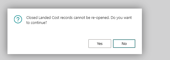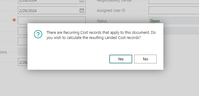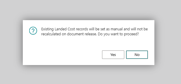 - If on Landed Costs Setup the field “Confirm on Document Release” is set to true, then a confirmation message appears to the user: