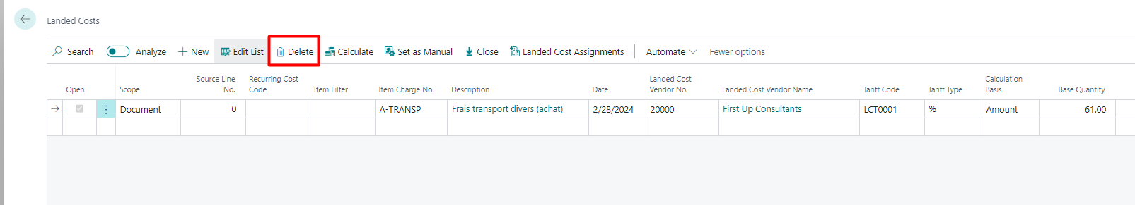 If a line is set to manual, all Landed Cost Lines will be set to manual. For these Landed Costs to be automatically calculated again, it is necessary to delete the lines first and after that, click on action “Calculate”. When clicking on action “Calculate”, the same Landed Cost that was deleted, will appear: