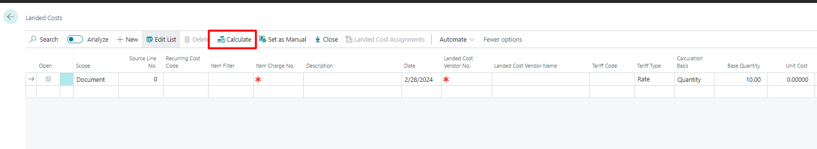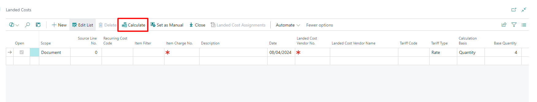 Landed Costs page will open - on that page, click on action “Calculate”: