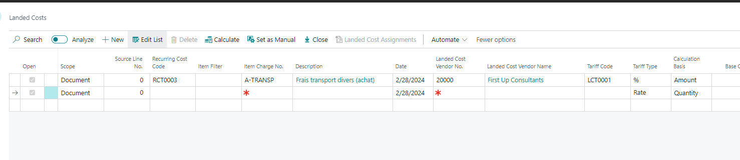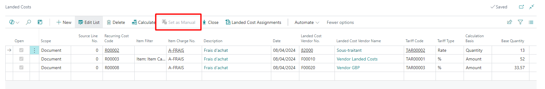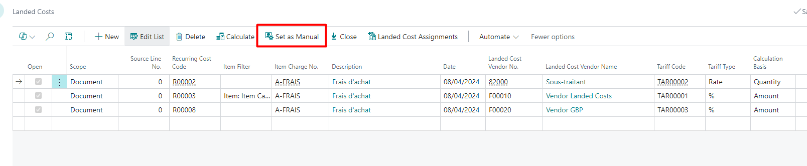 When setting Landed Cost as manual, all the lines will be set as manual; Recurring Costs code will disappear, and fields are editable: