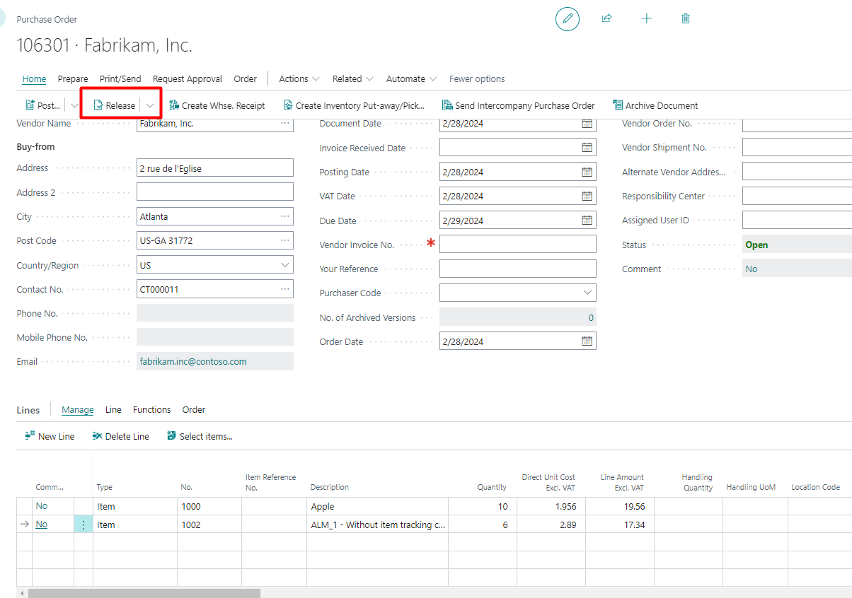 Create a Purchase Order and insert lines of type= Item and click on Release: