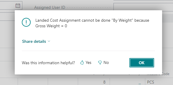 When a Recurring Cost is assigned by weight, the Item must have gross weight set on the item card. If not, an error message appears, and the Landed Costs aren’t calculated: