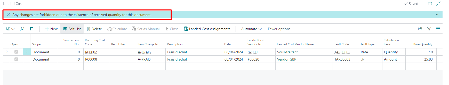 When opening the Landed Cost of a sales or purchase order, if there is at least one item that has been received/shipped, then all the Landed Costs are not editable and not calculable. It is also not possible to add new lines. In that case, an alert on opening the window informs that any changes are forbidden due to a receipt or shipment: